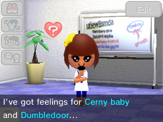 Another couple that got together, successfully, was Anime Girl and Cerny Baby. As you can see from down below, Anime Girl had a crush on both Cerny Baby and Dumbledore. As Dumbledore was in a relationship at the time, I chose Cerny Baby for her. They got together and Anime Girl actually asked to propose, see what happens in the next section.