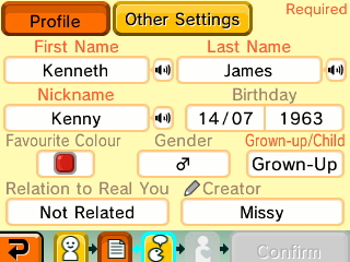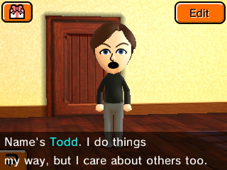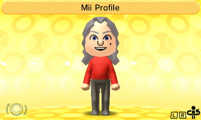 The second mii was Todd Howard from Bethesda Game’s studios. Todd was made purely because I was playing Skyrim just beforehand so he was the first person to come to mind. I tried my best to recreate him but as I haven’t met him it was hard to do his personality, which ended up being Easy-going Dreamer. From his interviews on YouTube I wouldn't think this was too bad, but not too good either, as he doesn't seem to hard core but also not very sensitive. So in the middle I guess.
